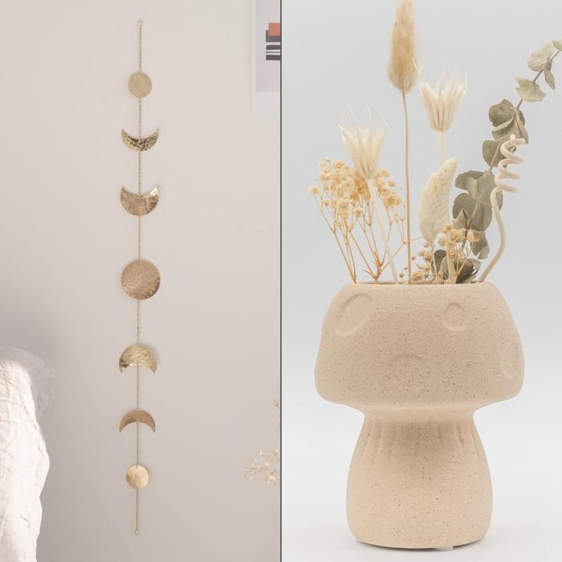Vase is quality ceramic with embossed black print and speckled white matte paint. Banner is made with hand-hammered gold metal moons and delicate chains, each is unique and original.