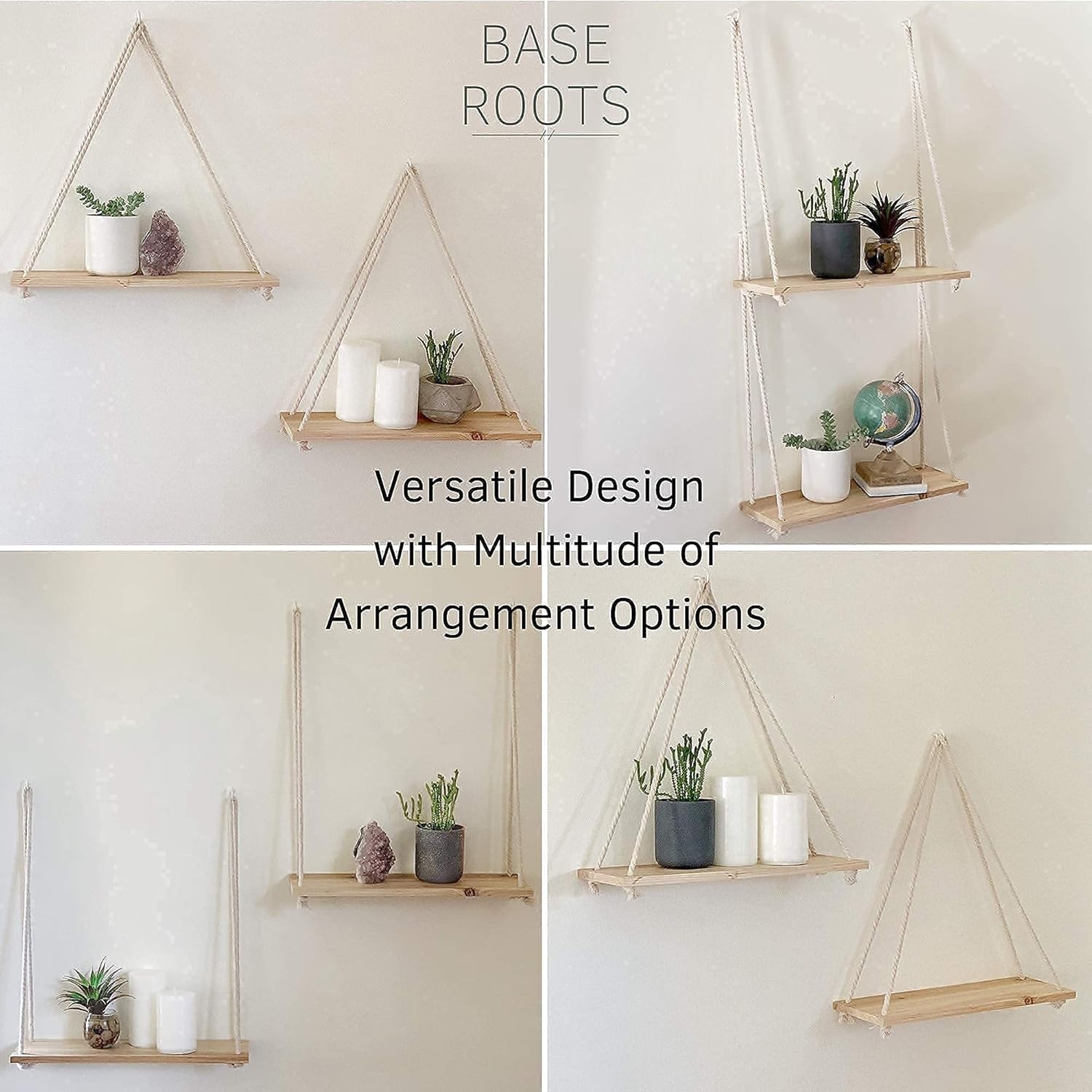 Each sturdy wooden shelf measures 16x5x0.5 inches, holds up to 8 pounds, the ropes adjust in length, includes 4 hooks. Ceramic vase has a drainage hole has a removable plug, width: 3″, height: 4.3″,
